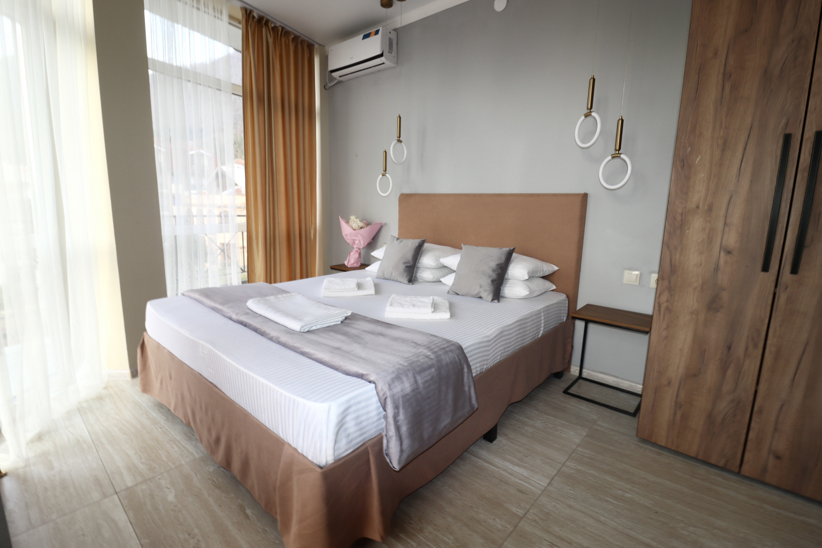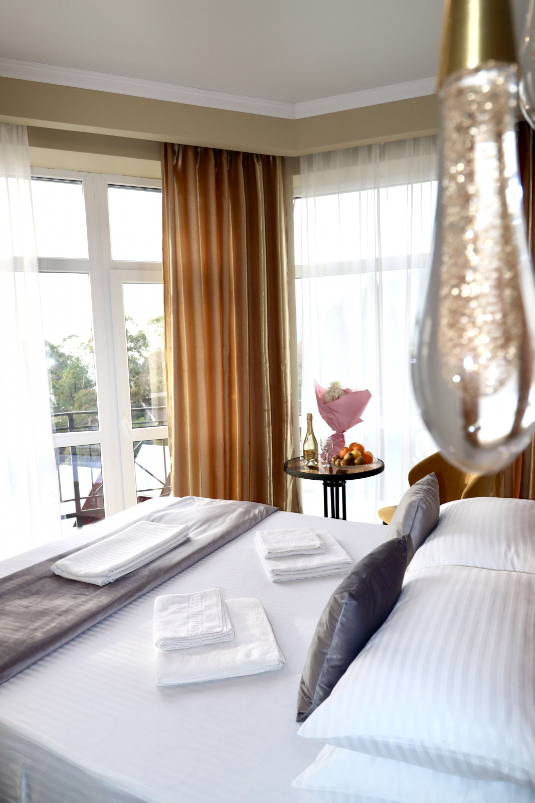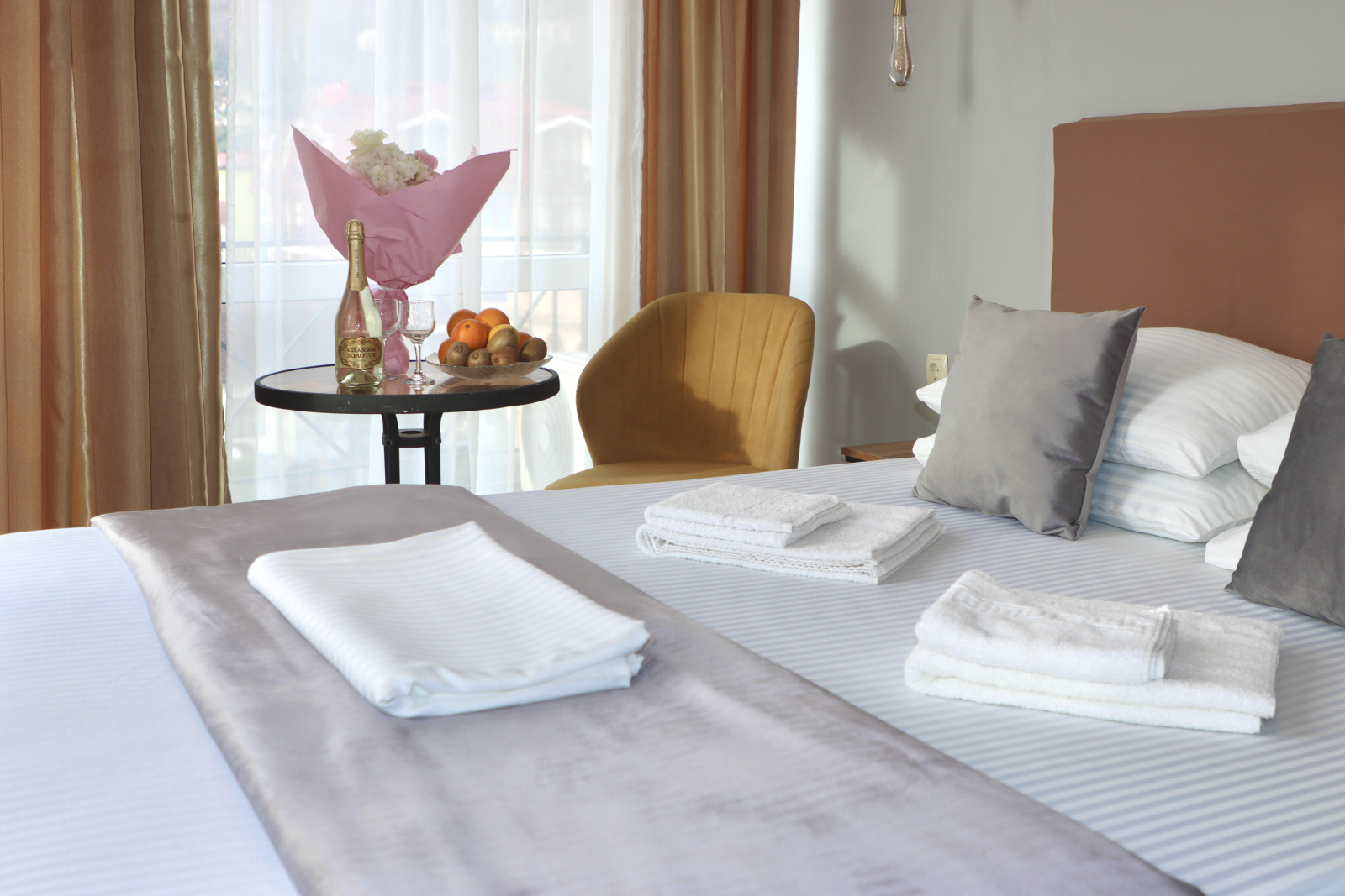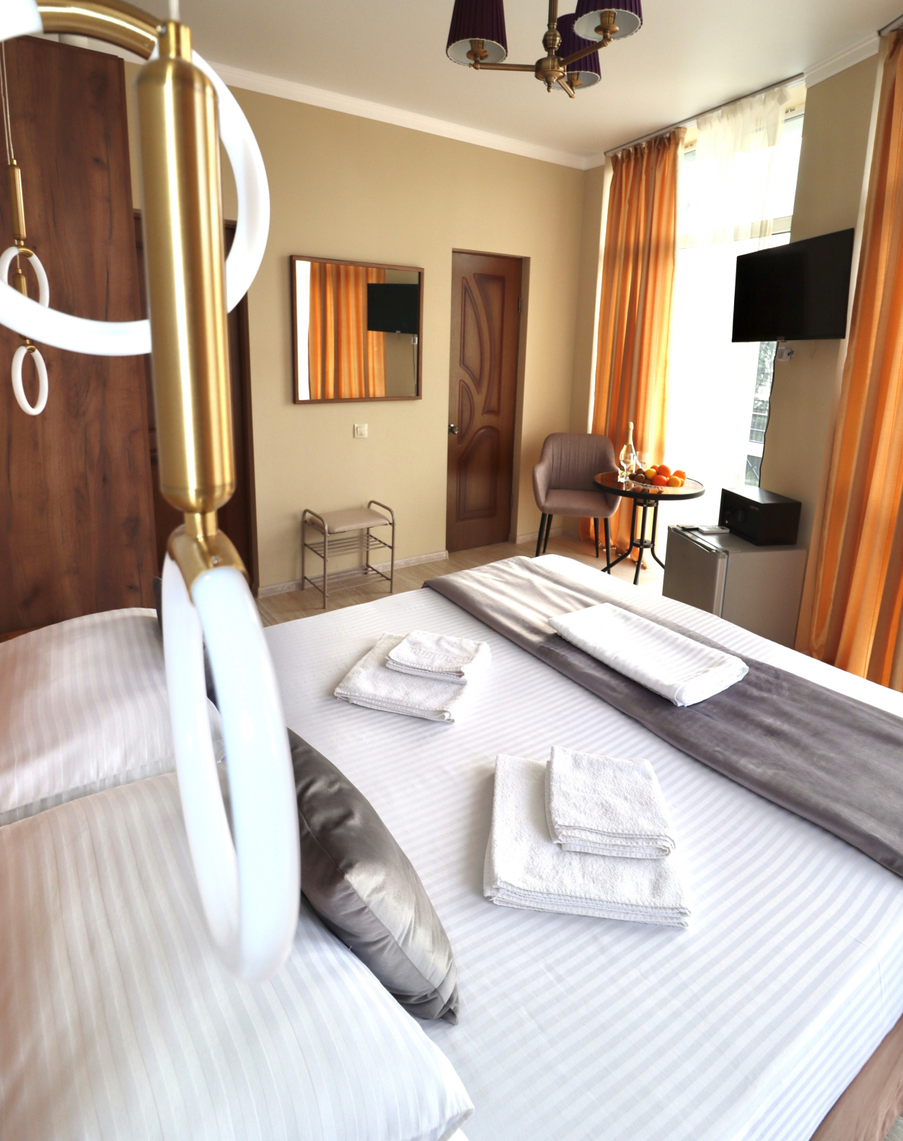 2 осн. места. Мебель: вешалка, зеркало, кровать двуспальная, прикроватные столики, стол, стул, шкаф. Оборудование: кондиционер, сейф, телевизор, холодильник. Санузел: с душем, туалетные принадлежности, фен. Сервис: Wi-Fi бесплатно, смена полотенец, смена постельного белья, уборка номера.
