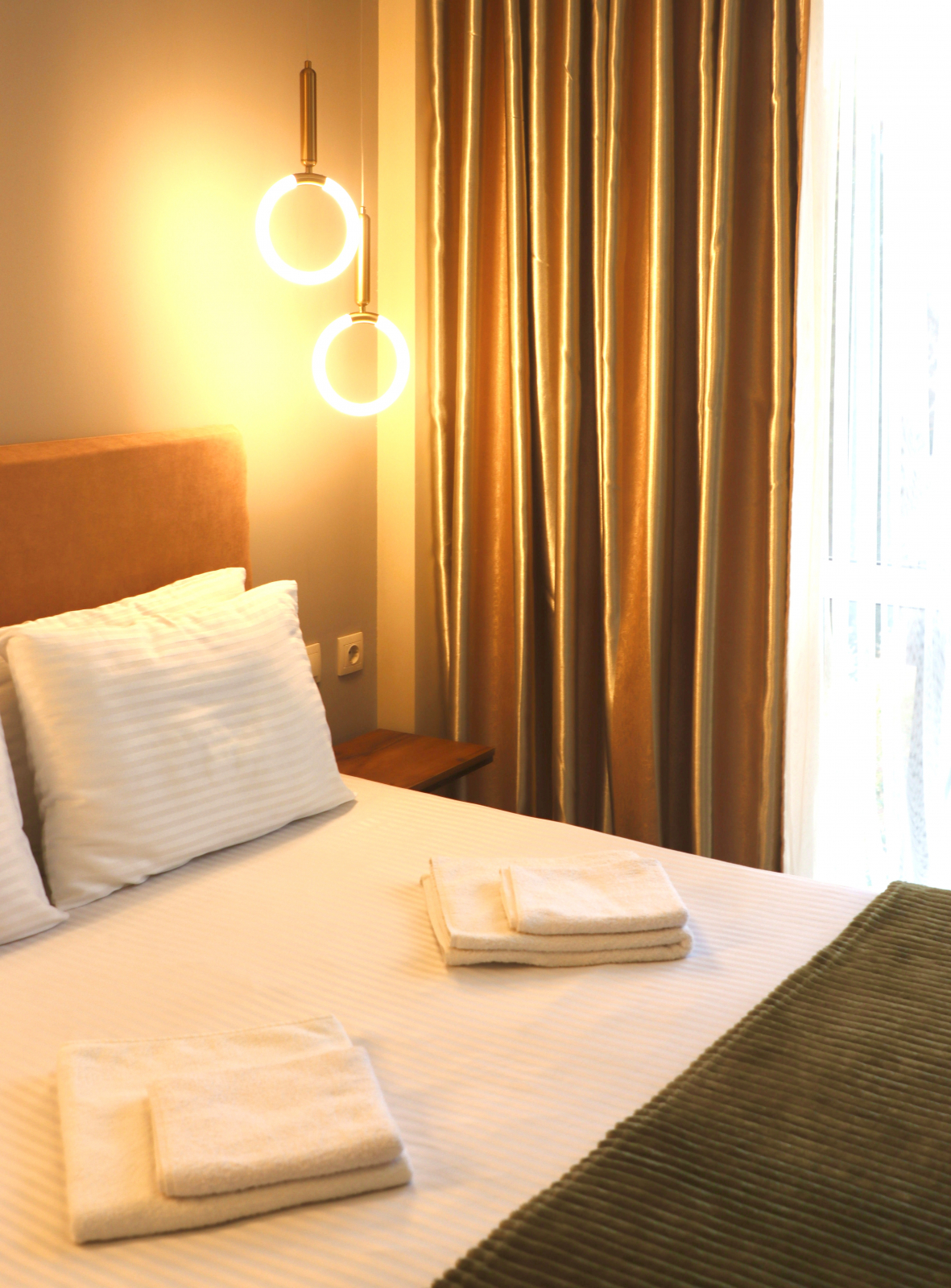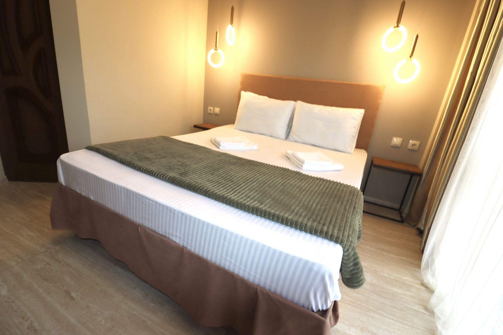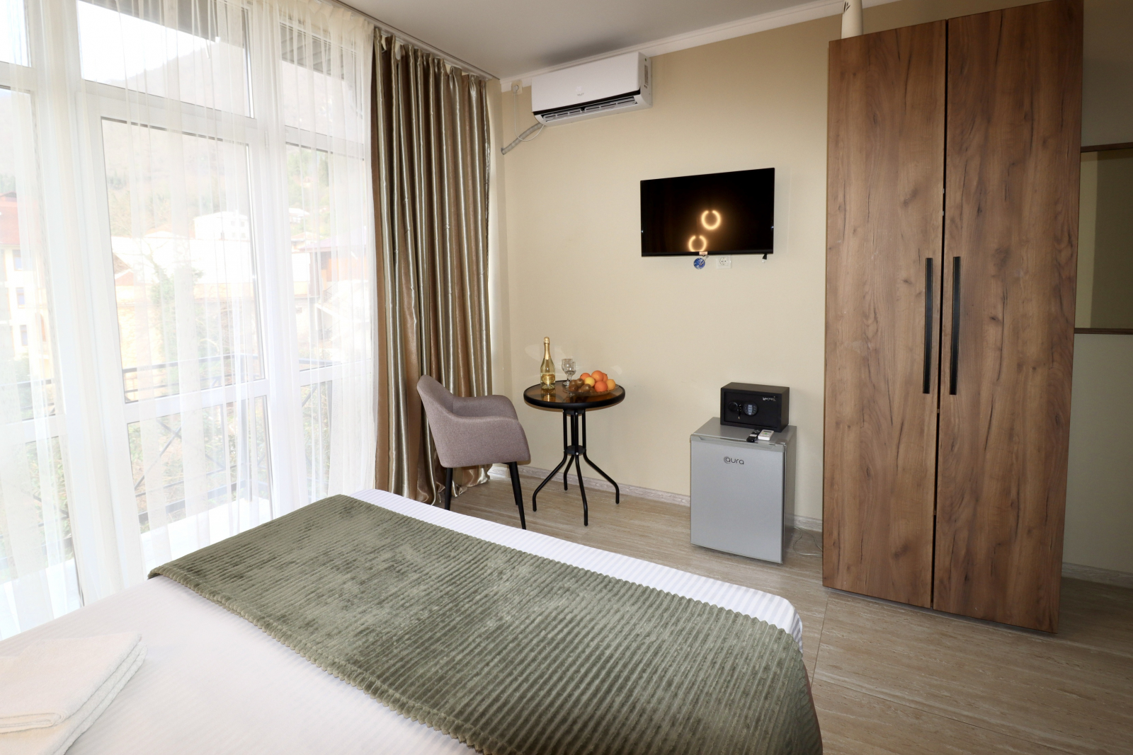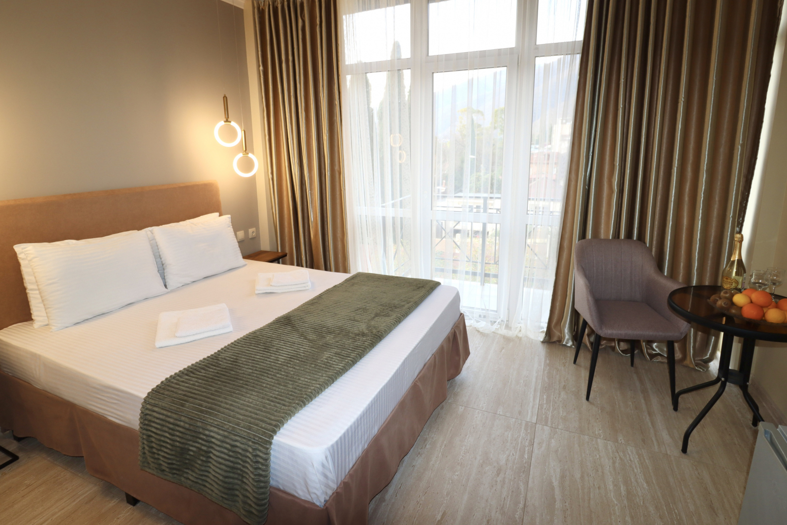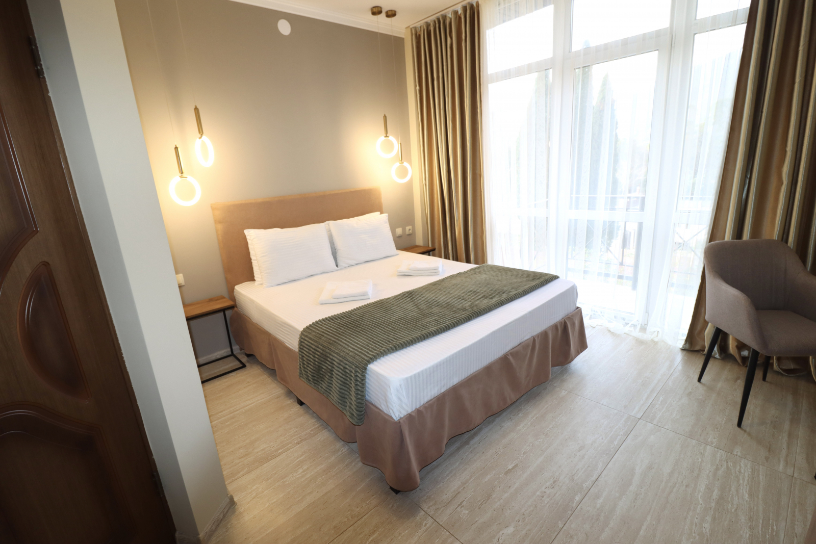 2 осн. места. Мебель: вешалка, зеркало, кровати односпальные /одна двуспальная кровать, прикроватные столики, стол, стулья, шкаф. Оборудование: кондиционер, телевизор, холодильник. Санузел: с душем, туалетные принадлежности, фен. Сервис: Wi-Fi бесплатно, смена полотенец, смена постельного белья, уборка номера.